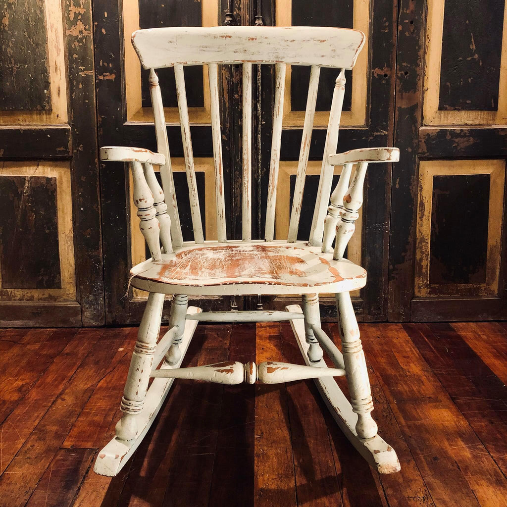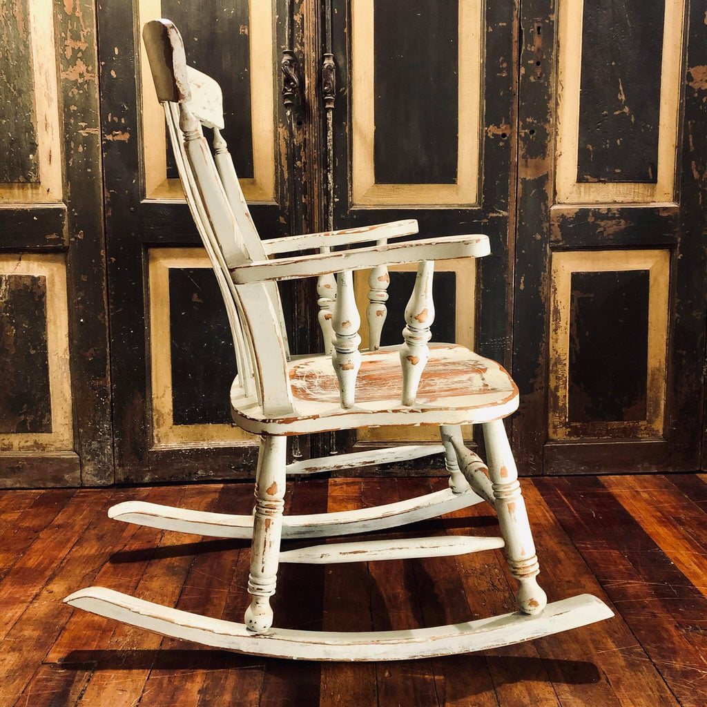 this lush light minty rocker has had some character carved and beaten into it, a few new coats, then beaten again.... she looks 100 years old now and is ready to add character to your farmhouse, cottage, fireplace, or a gorg gender neutral maternity chair.