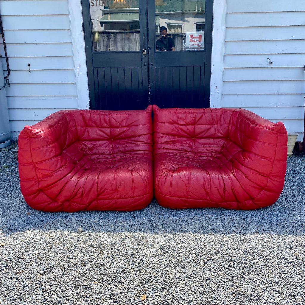 Sink into iconic comfort with this Ligne Roset Togo sectional in striking red leather. Designed by Michel Ducaroy in 1973, the Togo is a sculptural statement—low, loungey, and effortlessly cool. Its ergonomic form, soft folds, and rich leather make it as inviting as it is bold. A rare find in red, perfect for those who like their classics with a twist.