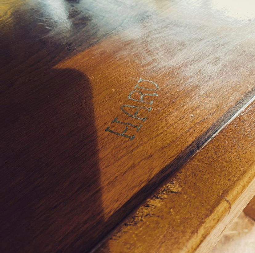 DESCRIPTION: Two gorgeous Japanese High School Tables (Price is per piece but happy to arrange a deal on both) with Provenance both burnt onto each tables leg. They have lived their lives at multiple schools and were supposedly shipped here by a famous Japanese ceramic artist, they moved in to @junkndisorderlynz and were purchased by a high end clothing designer... Finally lightly restored to amplify their tall tales by Storytellers!