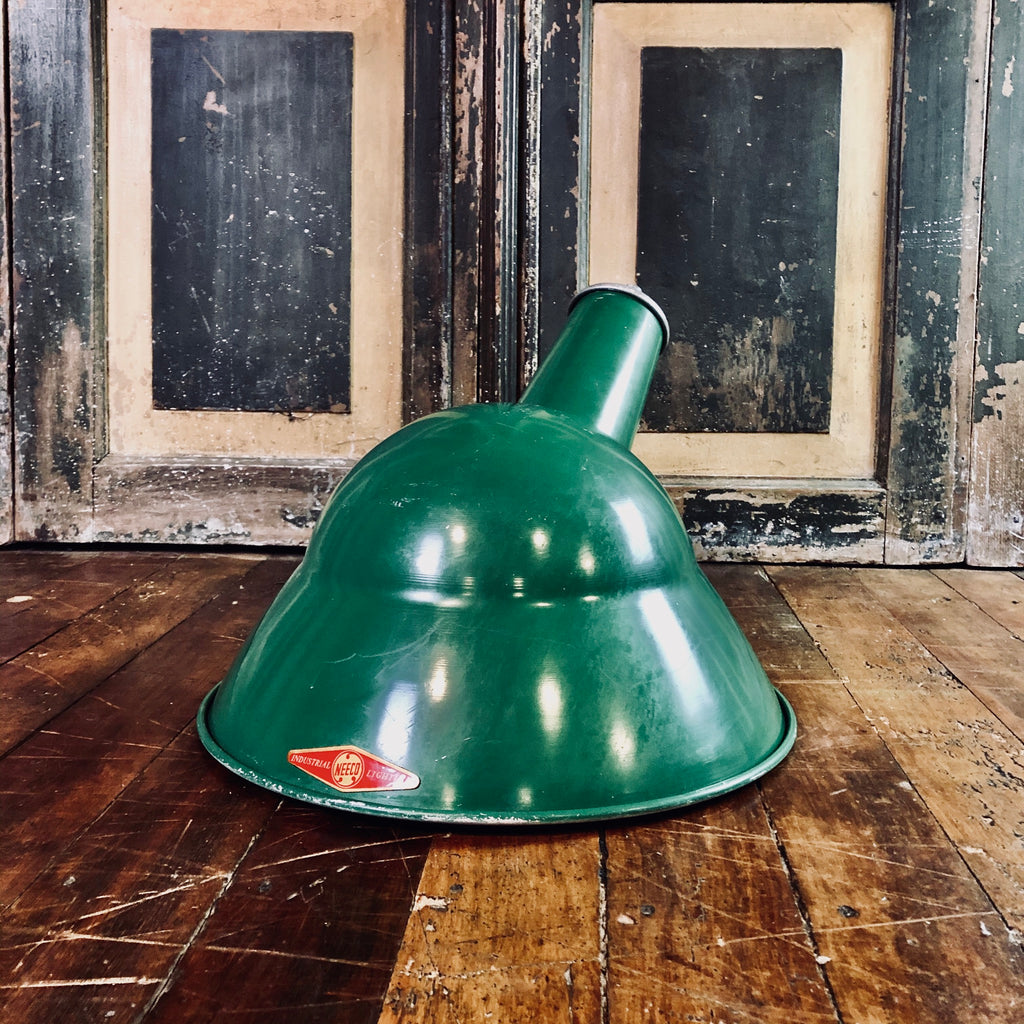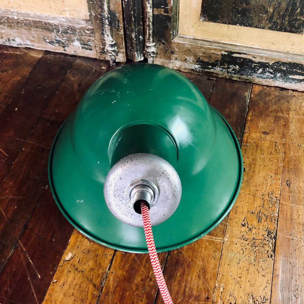 DESCRIPTION: I think we mainly bought these Parabolic wonder lights, solely because we wanted to say the word “Parabolic” more! What a fun word to say huh! Anyways.... These pretty parabolics were a lucky barn find down a long farming road to nowhere in the wild Waikato, often used to bring light to “hard to reach places” in factory’s and... (You guessed it!) Barns, due to their angled approach, these can be hung or wall fixed using steel plumbers pipe accessories, they are lightweight aluminium and sheen in Brunswick Green, a must for those who make their own trends.