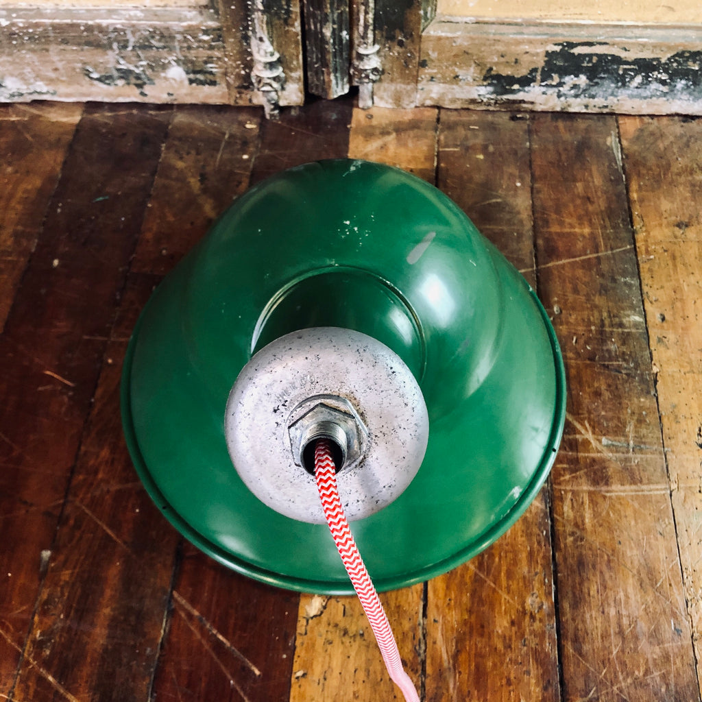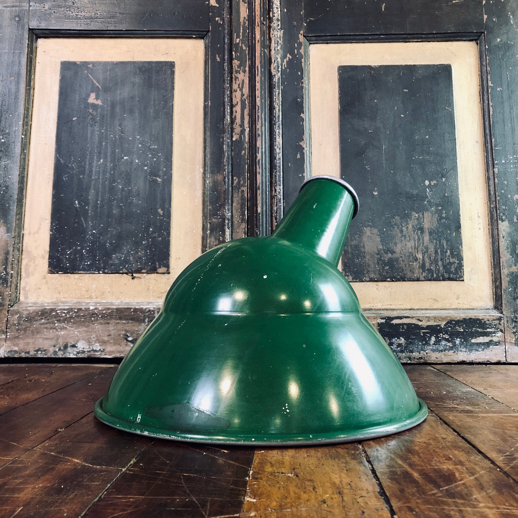 DESCRIPTION: I think we mainly bought these Parabolic wonder lights, solely because we wanted to say the word “Parabolic” more! What a fun word to say huh! Anyways.... These pretty parabolics were a lucky barn find down a long farming road to nowhere in the wild Waikato, often used to bring light to “hard to reach places” in factory’s and... (You guessed it!) Barns, due to their angled approach, these can be hung or wall fixed using steel plumbers pipe accessories, they are lightweight aluminium and sheen in Brunswick Green, a must for those who make their own trends.