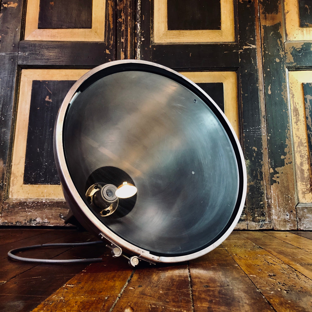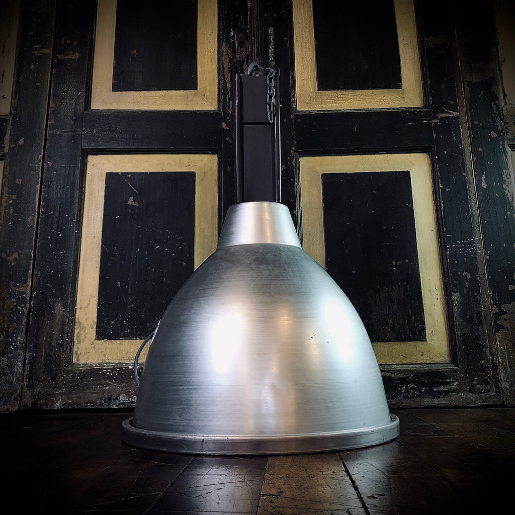 DESCRIPTION: Brown is the new black, at least that’s what Phillips thought in the 1970’s! These NZ made silver aluminium spun shades have something secretly special about them, they have a gorgeous glass bottom. They originate from the big smoke Auckland, once lighting up a huge electrical supplies company, Soon headed for the scrap heap after being replaced by newer modern LED versions, Storytellers wasn’t having it... they were stripped, cleaned and rewired to LED and look amazing hung high with a vintage bulb blasting through its glass glazed capping!